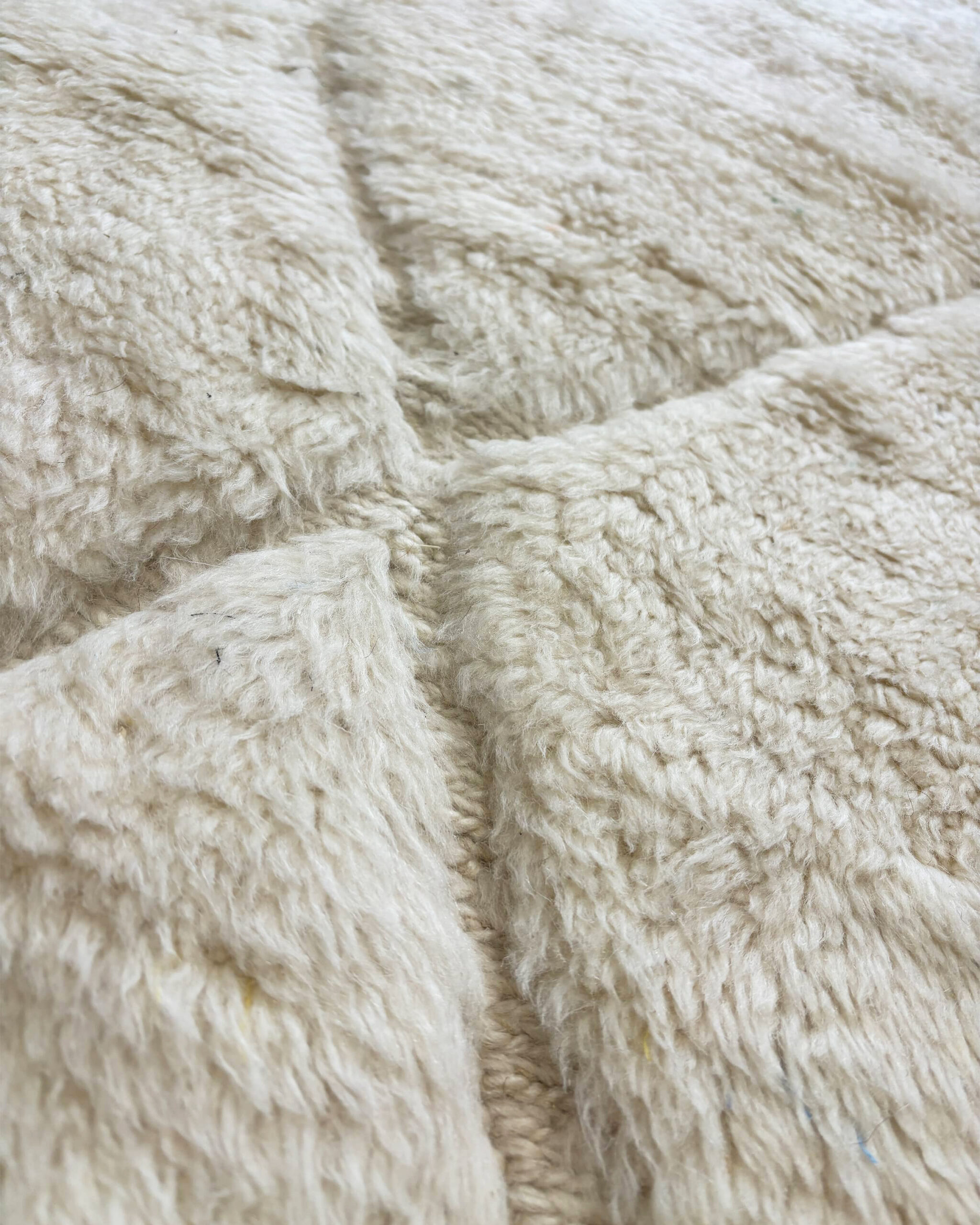 Beni Mrirt Creamy rug will charm you with its bushy texture and minimalist pattern. It is a master at inhabiting a space, to which it will add a new texture and comfort of natural fibers of the highest quality. It will help you create a cozy atmosphere at home and caress your feet with every step. Thanks to its moderate geometry, minimalist design and creamy natural finish, you can easily coordinate it with other solitaires in your home. The rug has fringes on one shorter side.