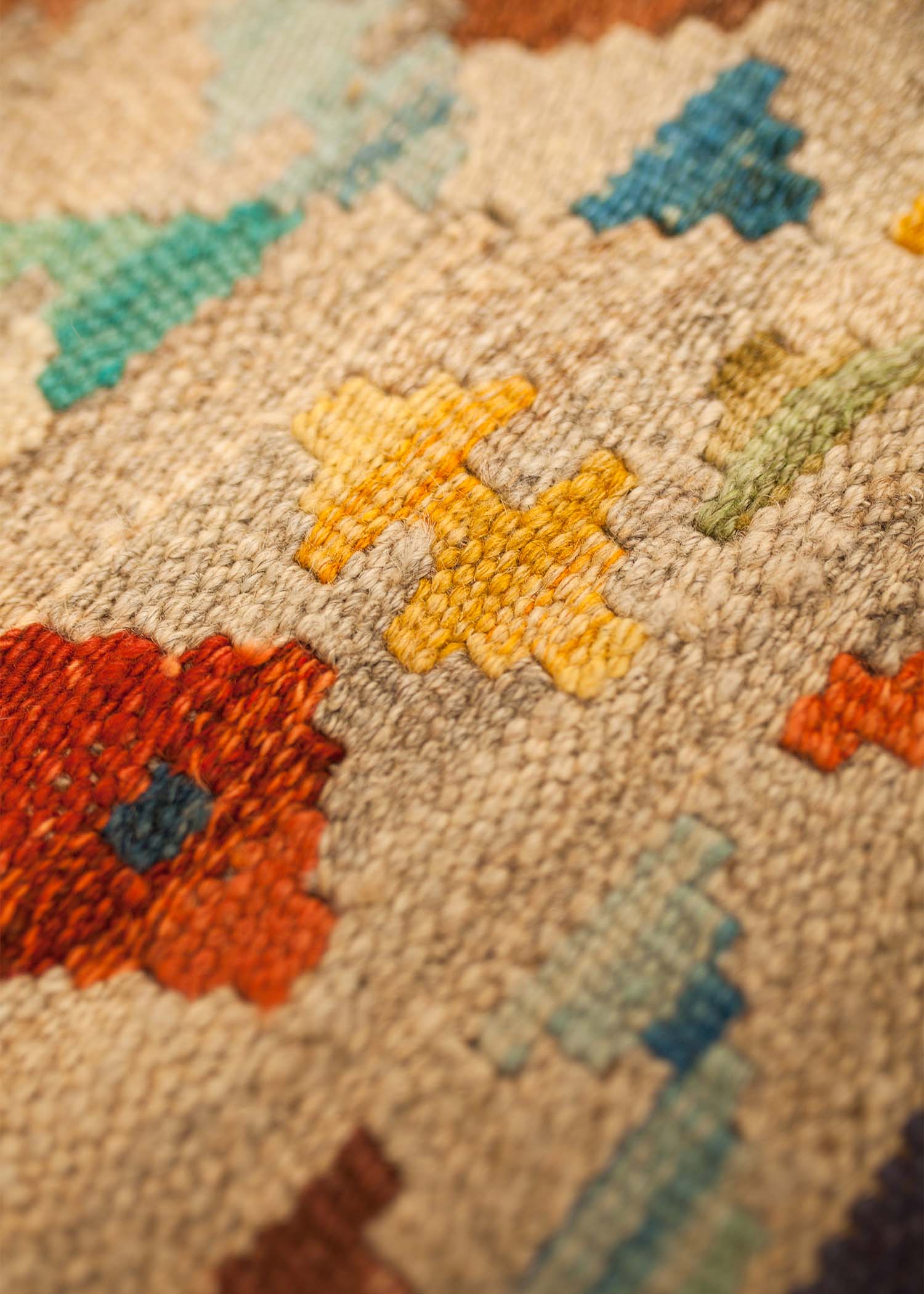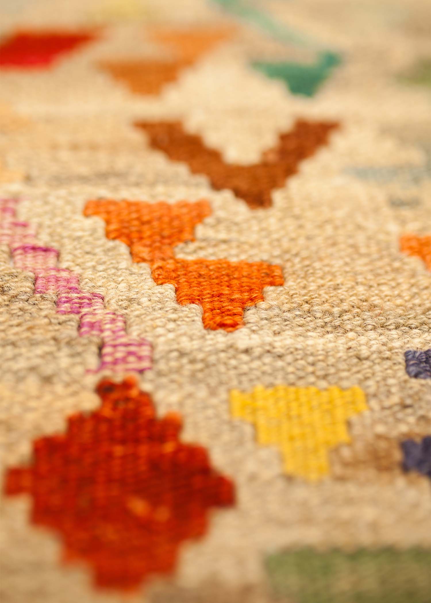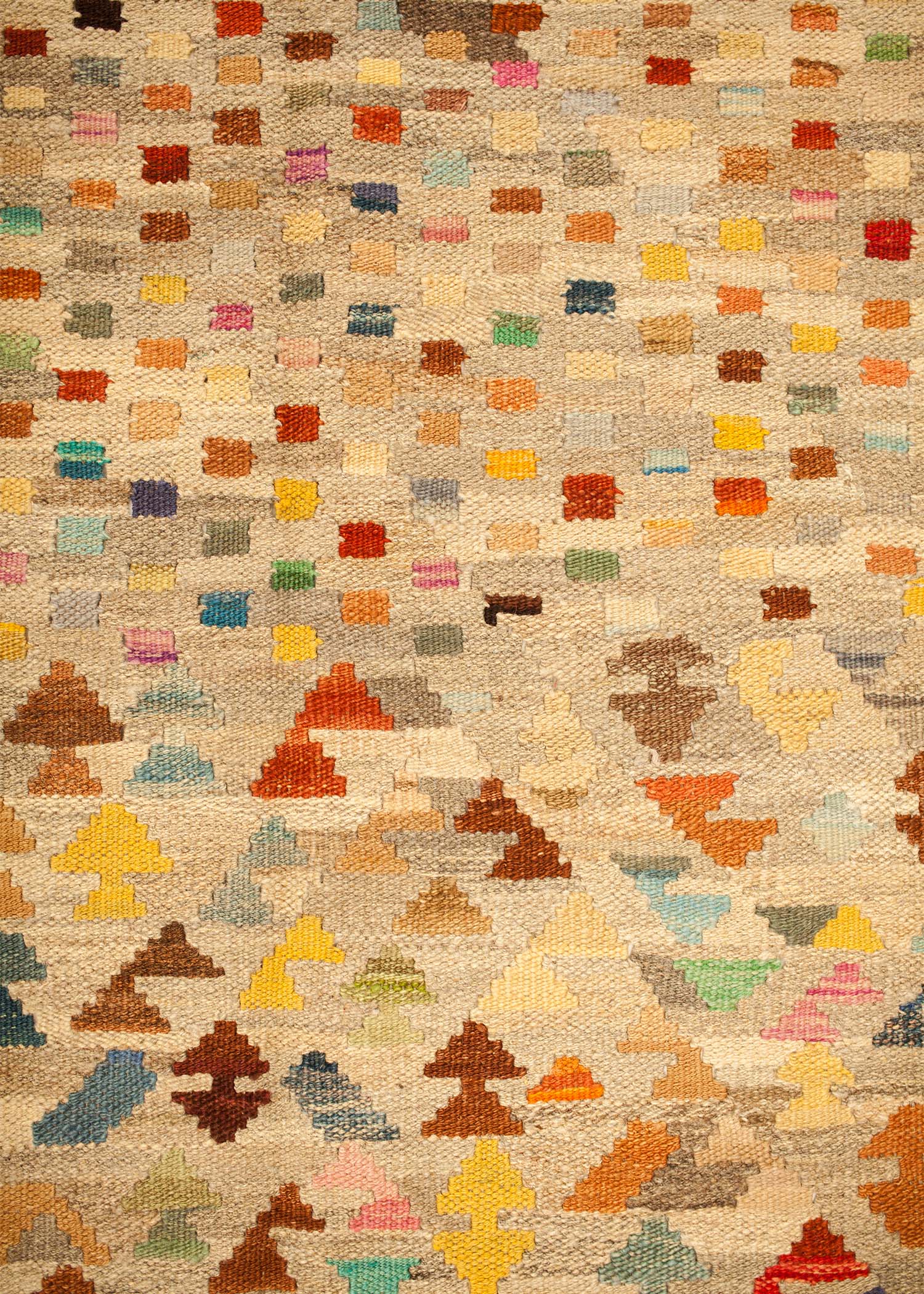 Small symbols of fresh colors are scattered on the grey mottled background. The rug unleashes playfulness in your mind. Can you find two identical symbols? The colored mosaic gracefully blends into your interior and harmonizes with the other items in the room. It looks great on both wooden and concrete floor. Thanks to its color palette, it will also work well under the dining table.
