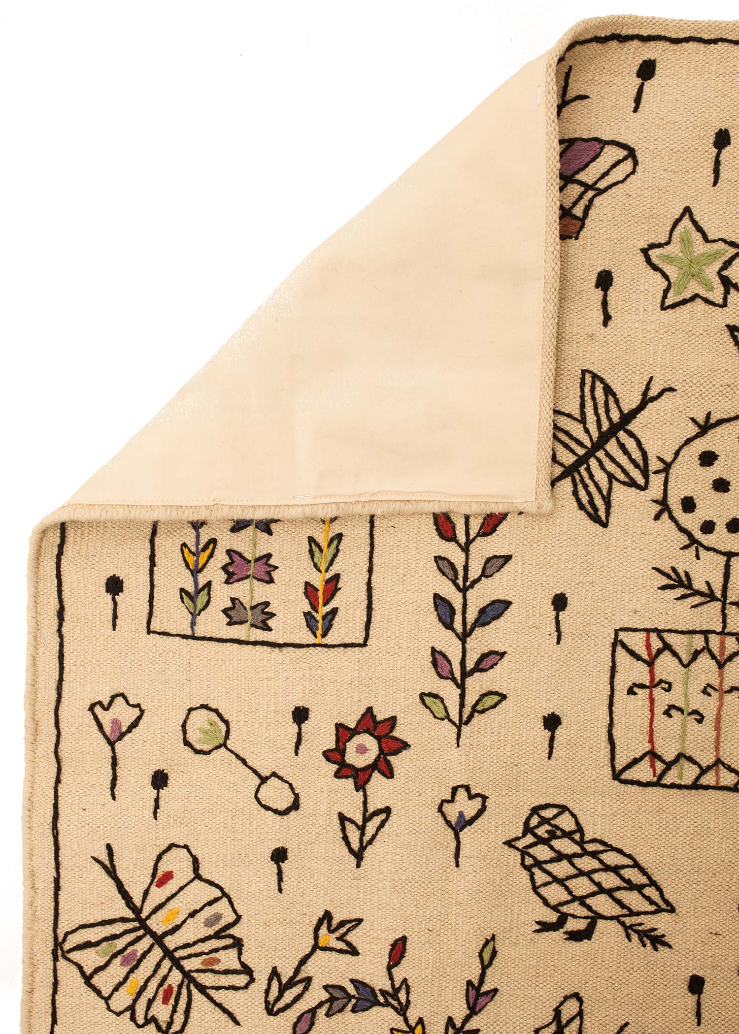 woven base made of undyed sheep’s wool, hand embroidery, cotton lining