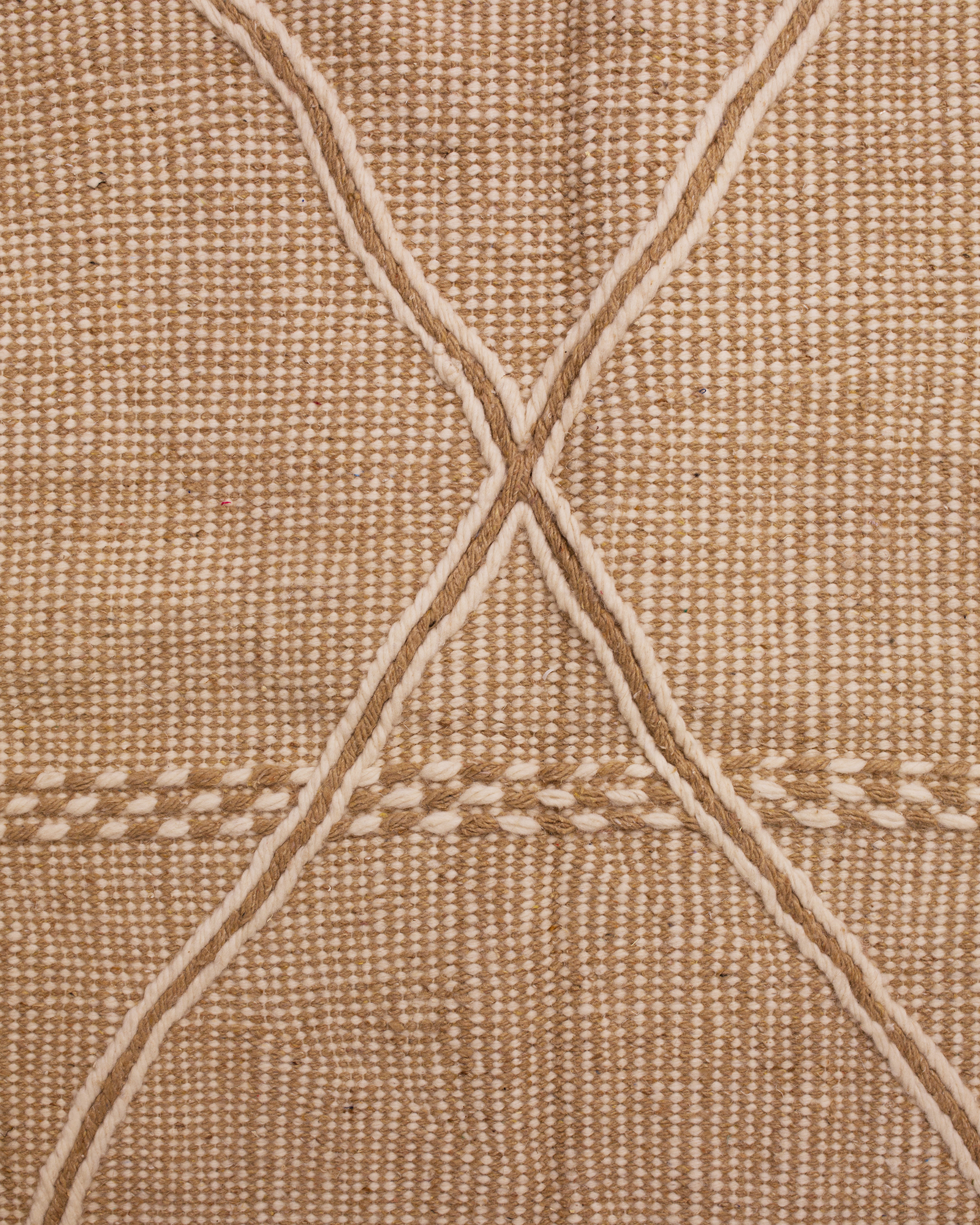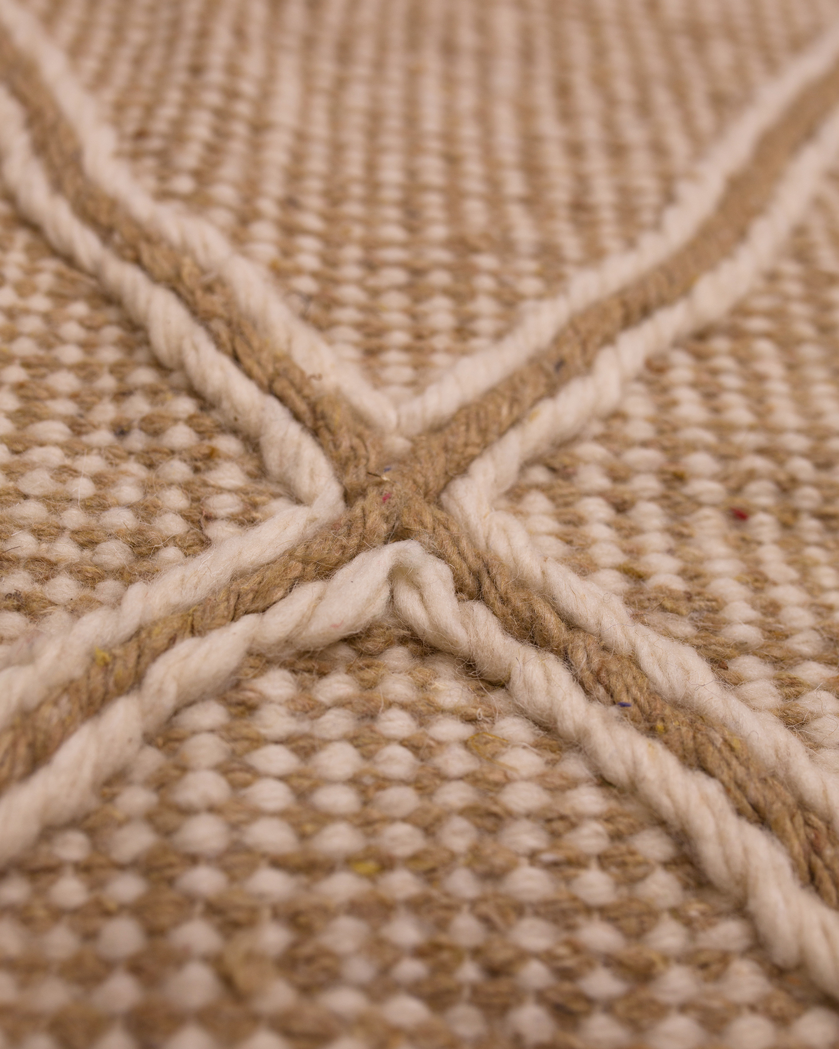 This rug woven in simplied zanafi style will enchant you with its minimalist look. The attractive geometric composition with woven diamonds blends gracefully into your home and easily connects with other solitaires in your kitchen, living room, bed room or the hallway. The brown and white combination and practical flat weaving will definitely not bore you.