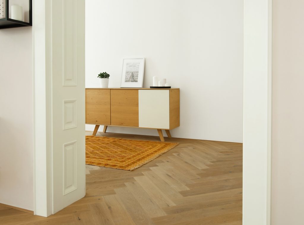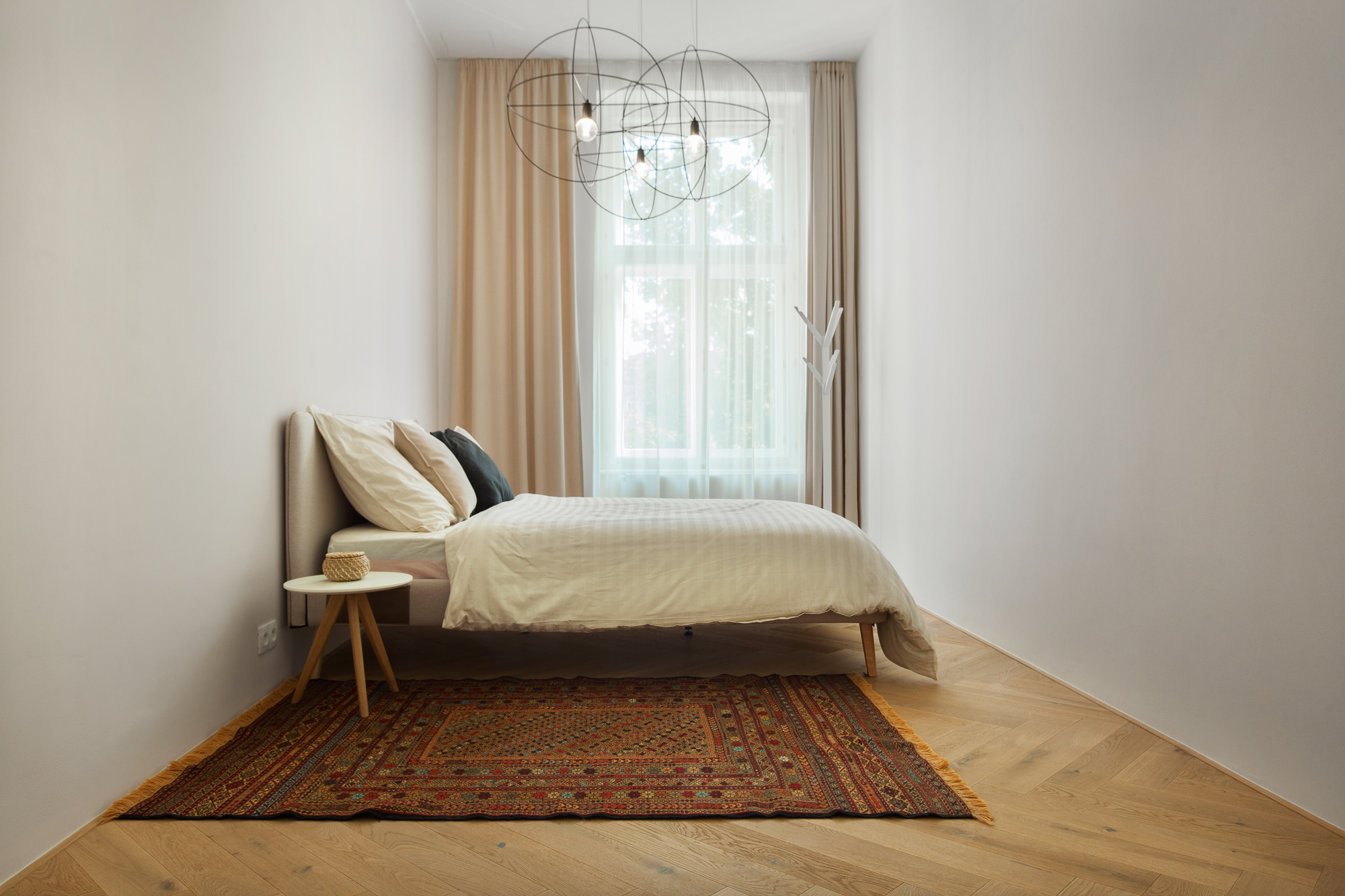 Byt je velmi světlý s vysokými okny. Okamžitě se tu cítím dobře a začínám rozmisťovat naše kusové koberce. Volím geometrické vzory i propracované zdobné kusy. Věřím, že s parketami vysoké kvality, které na jižní Moravě vyrábí rodinná firma Princ Parket, budou v krásné harmonii.