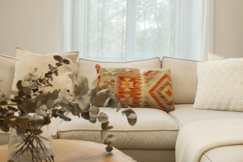 Dekorativní polštář se zabydluje na gauči a pěkně ladí s kobercem.
