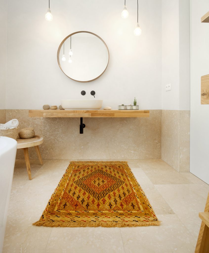 Drobný mushwani koberec umisťuji také do koupelny. Jeho krémový základ krásně ladí s dřevěnými doplňky v místnosti. Najednou mám pocit, že bez něj je koupelna neúplná. Pro bosá chodidla je jeho trojrozměrná měkká struktura přímo pohlazením.