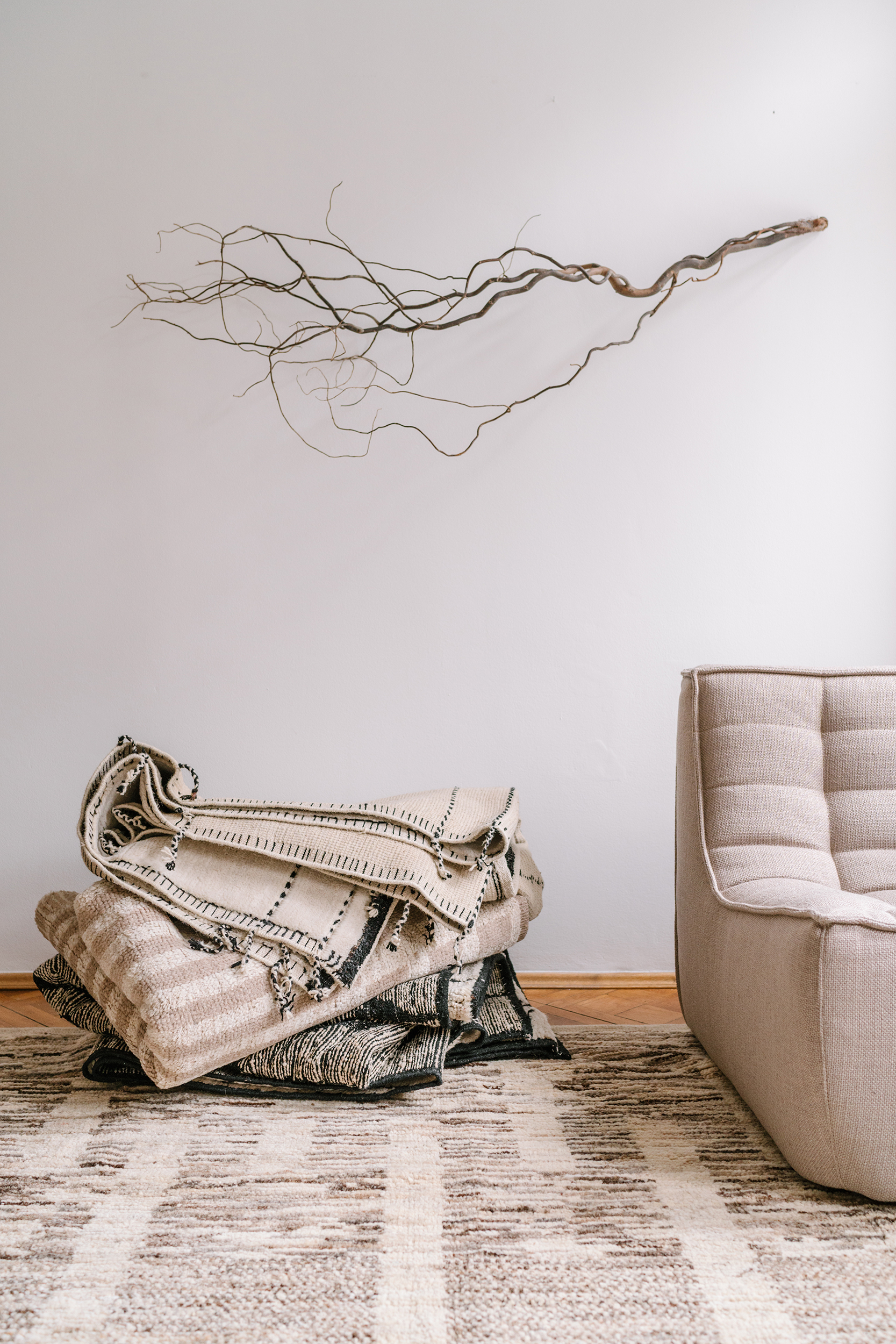 Výroba probíhá v okolí pákistánského Péšávaru, kde podporujeme afghánskou komunitu s dlouhou tradicí ručně vázaných koberců. Vlna je předena ručně a vázána perským uzlem do finálního kusu, který přetrvá generace. Ráda vám o každém kroku této jedinečné tvorby povím více.