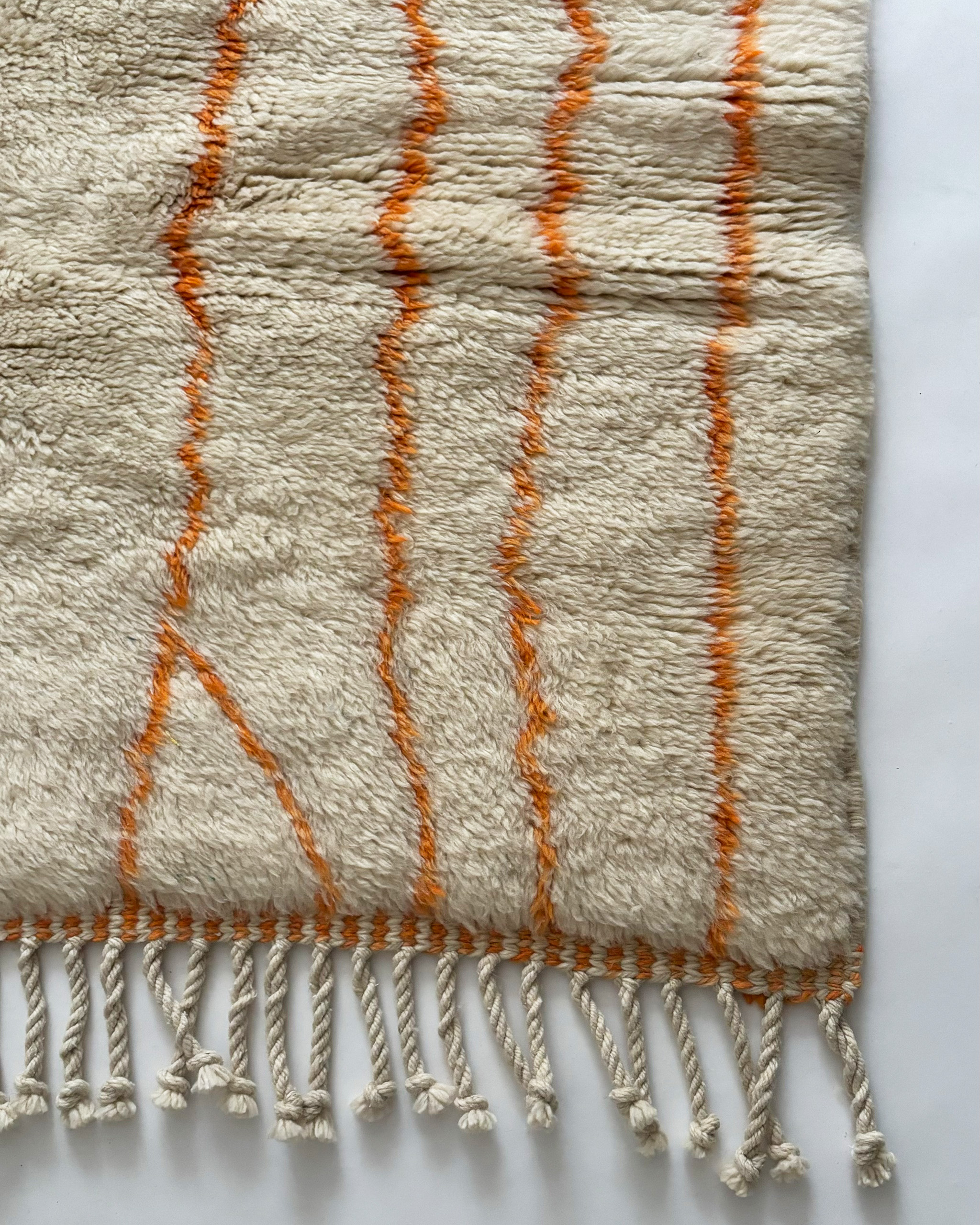 Beni Mrirt Orange Lines je vázaný obraz. Oranžové abstraktní linie jsou jako tahy perem vykresleny do krémového podkladu. Hebký dlouhý vlas je zakončen zdobným lemem a třásněmi pouze z jedné strany koberce. Nadčasový kus dodá atraktivní prvek, jemnou texturu a komfort hebkého vlákna vašemu domovu.