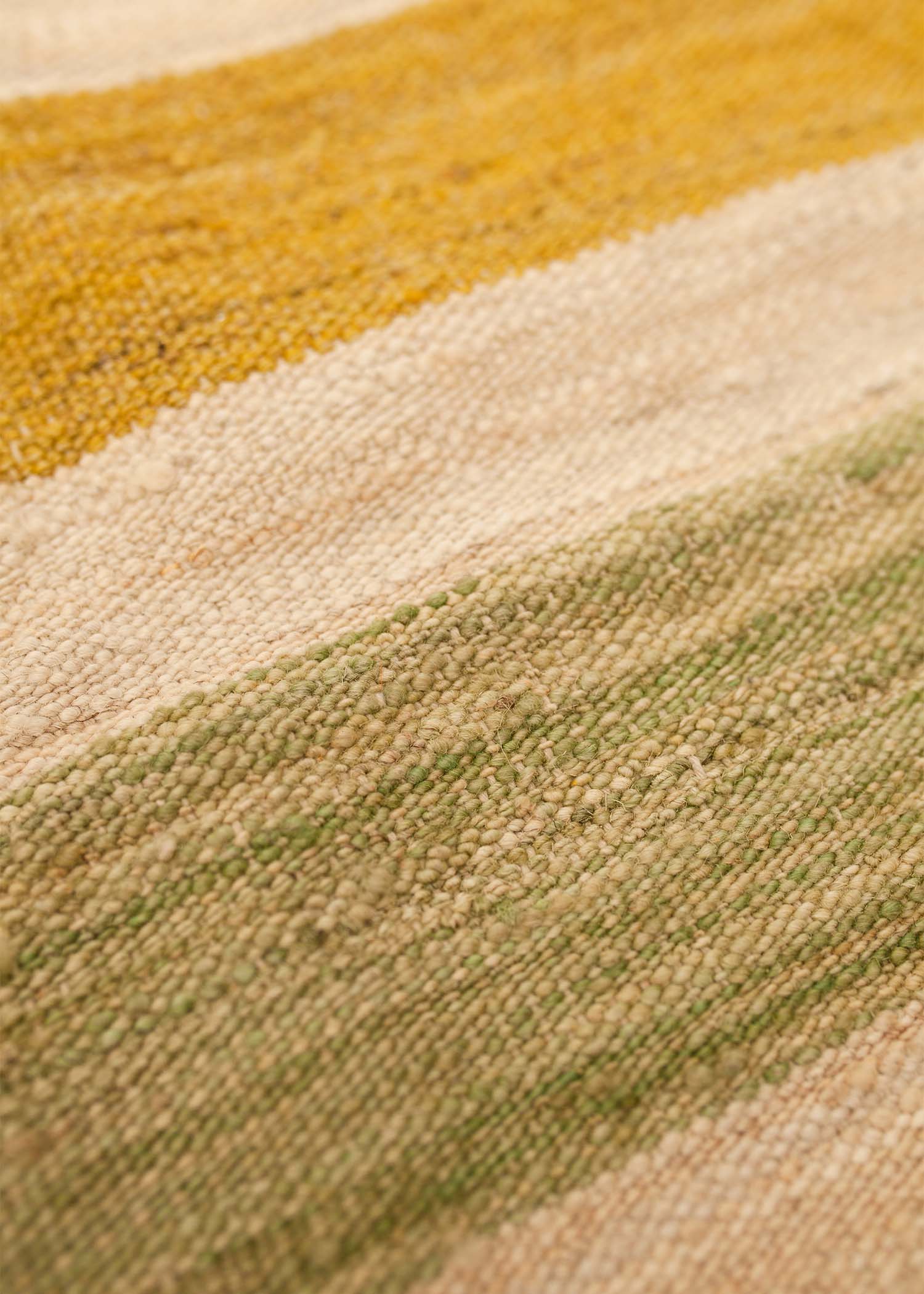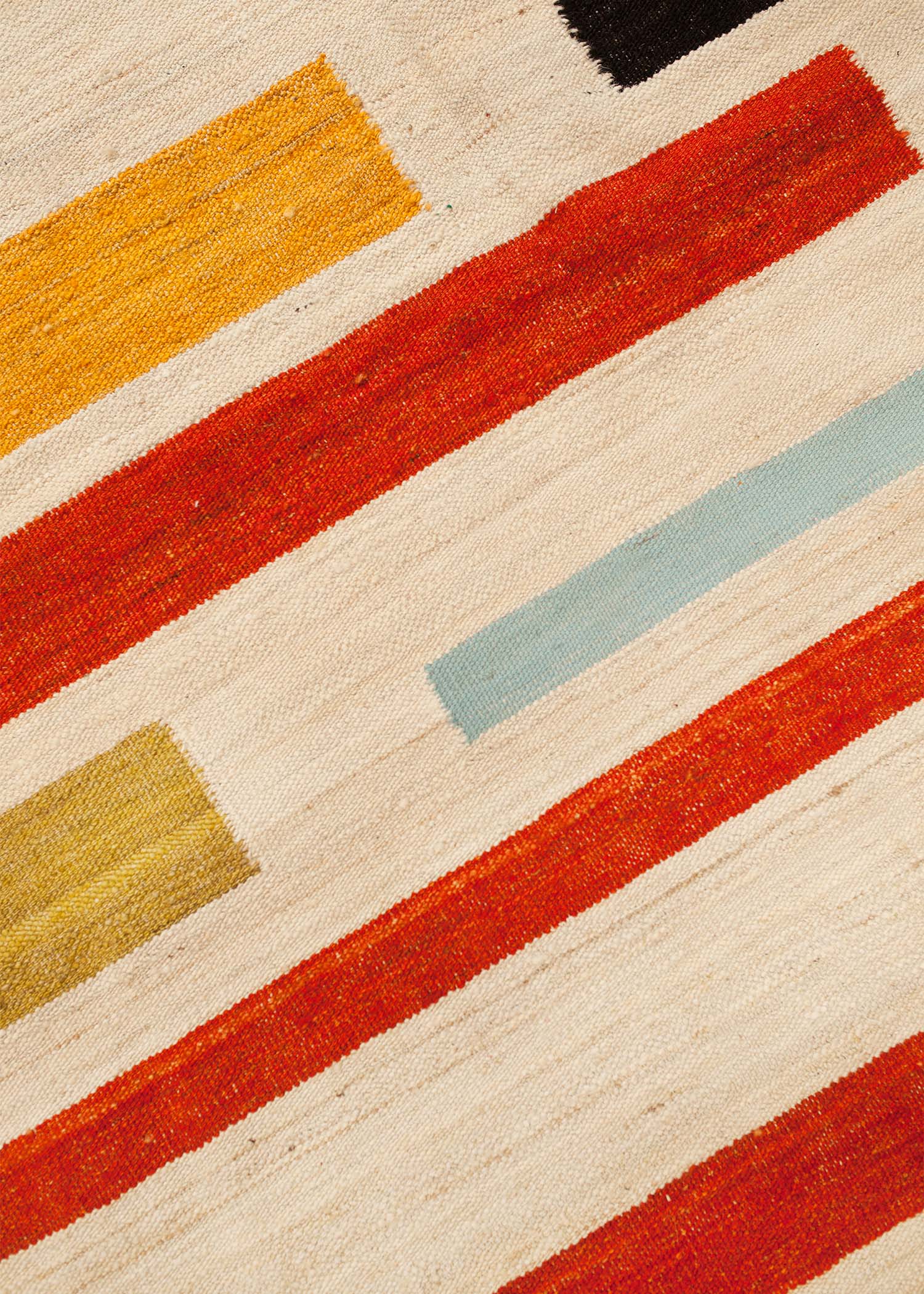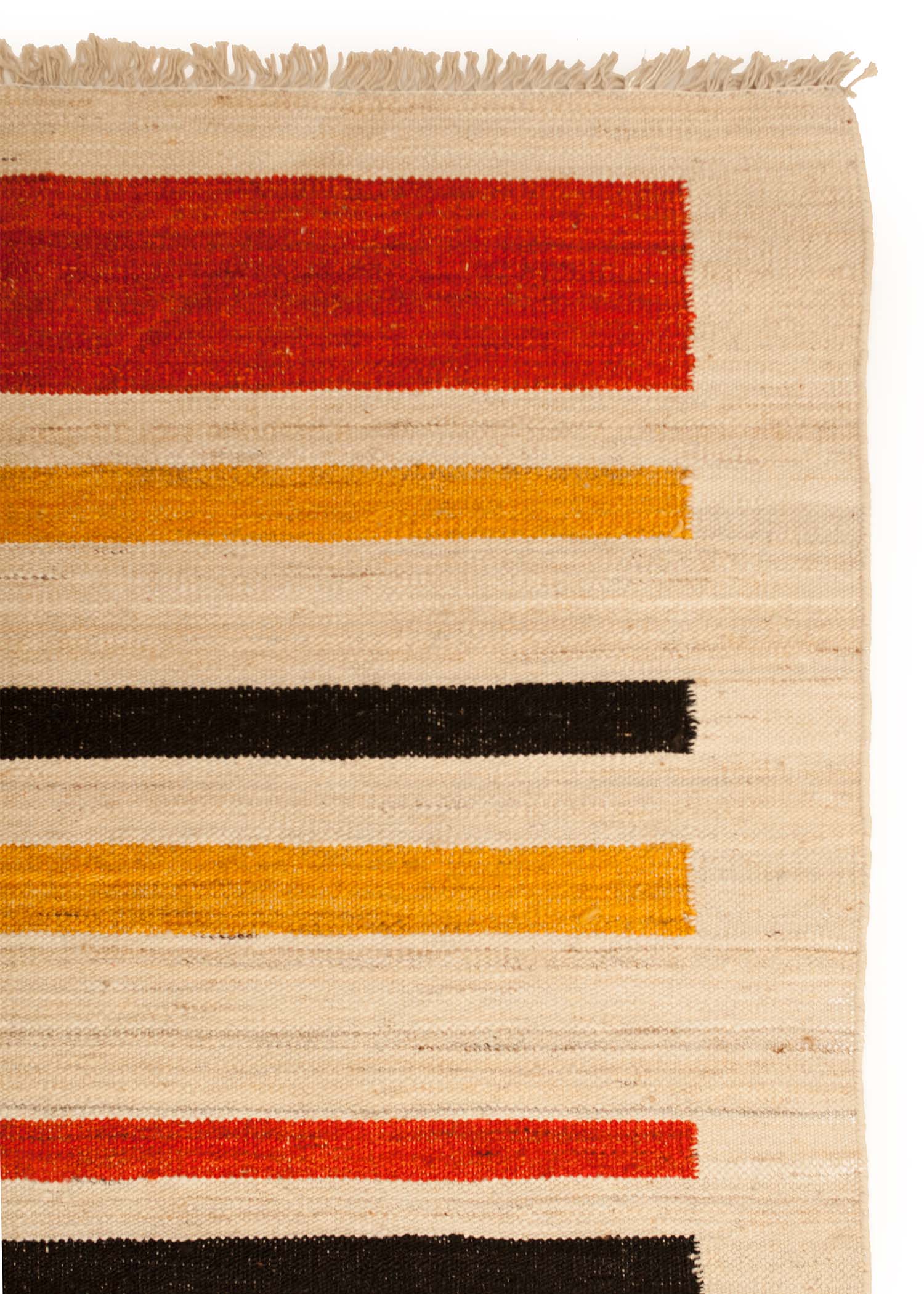 Barevné pruhy hezky kontrastují s přírodním krémovým podkladem. Dopřejte si dávku svěžesti do vašeho interiéru. Ručně tkanému kilimu v barvách z přírodnin to moc sluší na dřevěné podlaze i betonové stěrce. Výhodou je stejný rub i líc a snadná péče.