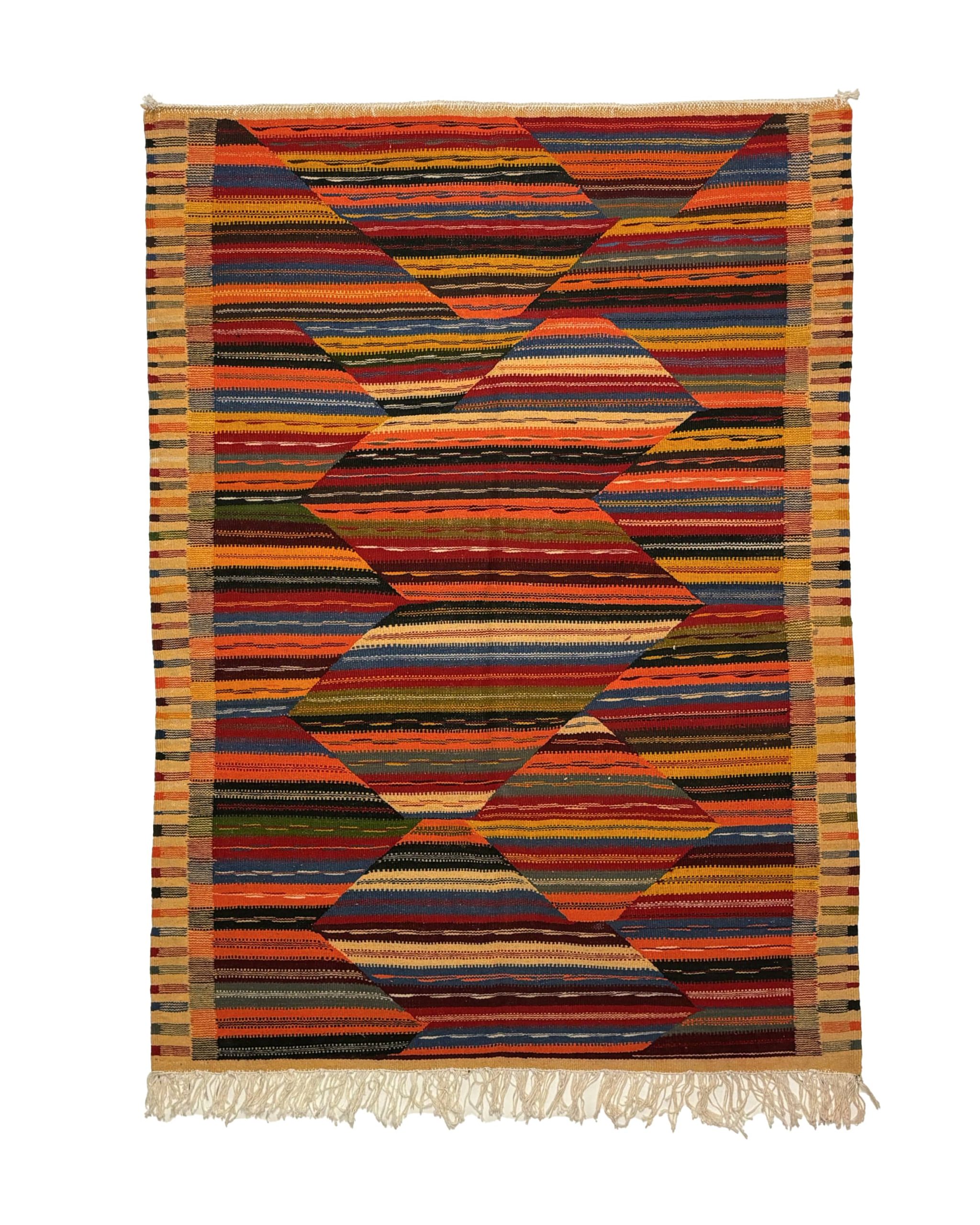 The Zayan rug is a traditional product for the Berber community of the same name in the Middle Atlas. The characteristic richly decorated stripes alternate with deep reds on a larger size handwoven rug. The unique decor plays beautifully in the interior and gives it a touch of long journeys and the Moroccan sun.
